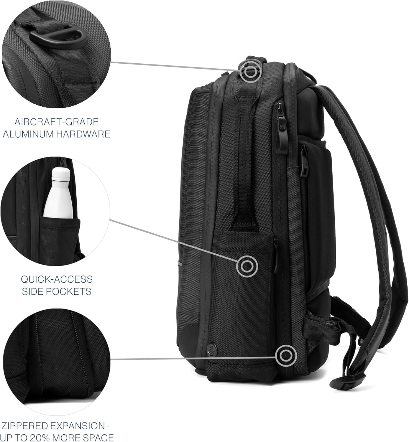 Sacrifice nothing but bulk with the Travelpro Altitude Slim Expandable Laptop Backpack 20-24L. Designed by pros for the modern pro, this sleek backpack is loaded with features to keep you and your gear organized on the move. Whether you're crushing your daily commute or heading out for a weekend adventure, this bag keeps your essentials close and your style on point. Seriously tough but eco-friendly, the high-density ballistic ECOFAB exterior with DuraGuard coating shrugs off stains and scrapes, while the ECOFAB interior lining with H2O guard keeps things clean and green. Need more room? Just unzip the expansion for an instant 20% boost in space. Protect and organize your gear like a boss with multiple compartments, a built-in key leash, padded sleeves for your laptop and tablet, and a Travelpro ID TheftBlock pocket for your cards and passport. Plus, the dedicated pocket for your tracking device and discreet anti-theft pockets add extra layers of security. The Travelpro QuickSlip pocket with magnetic closure is a game-changer for easy cellphone access, and dual side pockets stash water bottles, umbrellas, and other grab-and-go essentials. Full-grain leather touch points, airline-grade aluminum hardware, and hardy, water-resistant and traditional YKK® zippers add serious style and toughness. The padded airflow back panel and adjustable shoulder straps keep you comfy all day long or use the rear stacking strap to secure the backpack to a rolling bag when you need to go hands-free.
