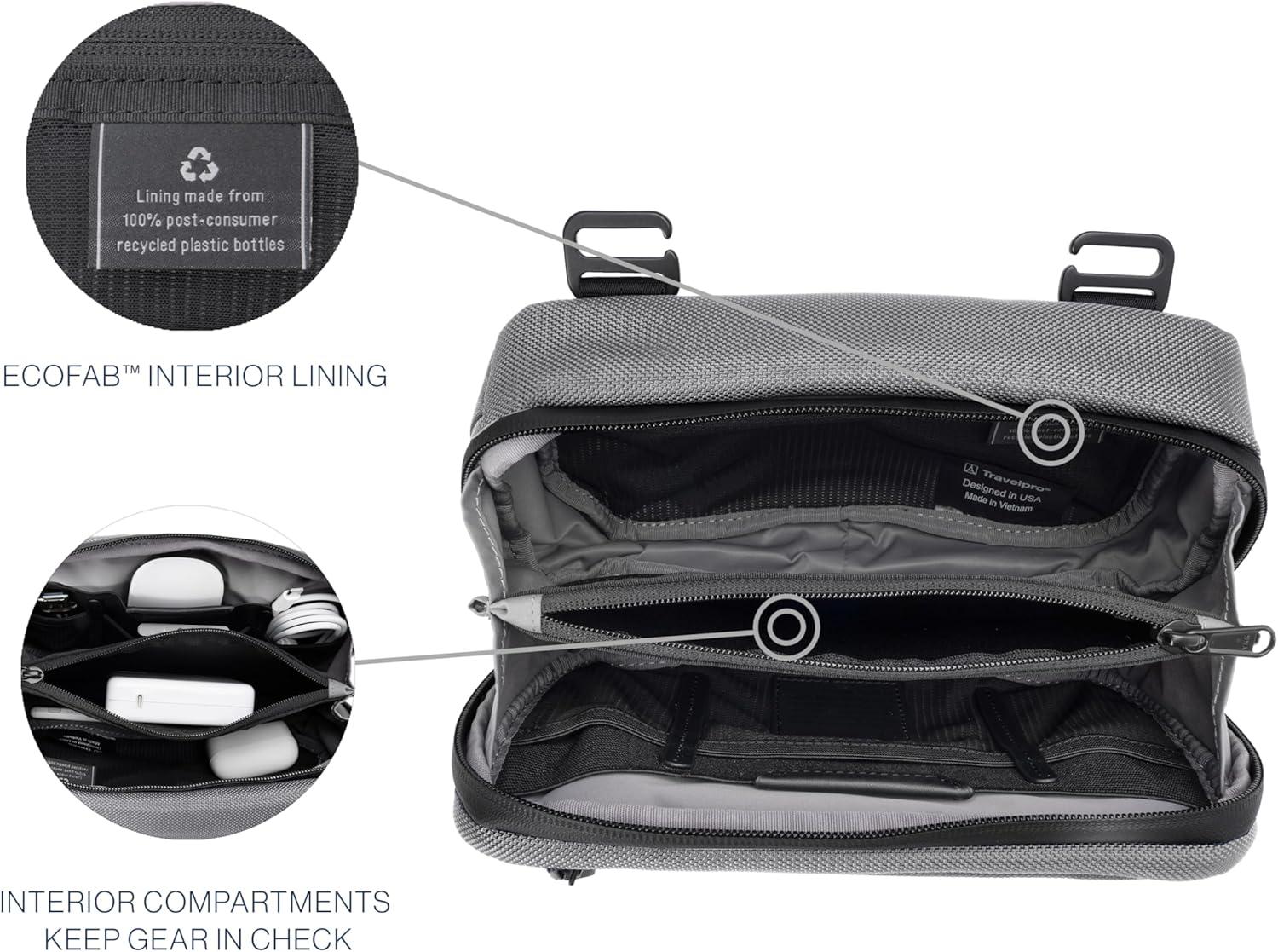 On the move, you don’t have time to dig. Keep your tech essentials a grab away with the Travelpro Altitude Organization Kit. Designed by pros for those who live life on the go, this kit conveniently and securely hooks to the inside or outside of your compatible gear. A quick-access front zippered pocket and interior compartments organize your cords, chargers, and other accessories, keeping them tidy and easy to find. Style and durability collide with full-grain leather touch points, airline-grade aluminum hardware, and ultra-resilient fabrics. High-density ballistic ECOFAB exterior material with DuraGuard coating shrugs off stains and abrasions, making it as tough as your daily grind. Plus, the ECOFAB interior lining with H2O guard is made from 100% post-consumer recycled plastic bottles, so you’re helping the planet too. Water-resistant and traditional YKK zippers guarantee smooth, snag-free access every time.