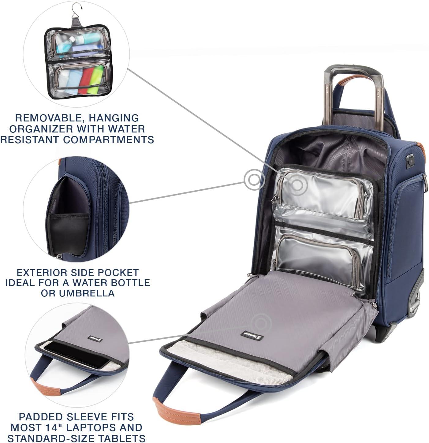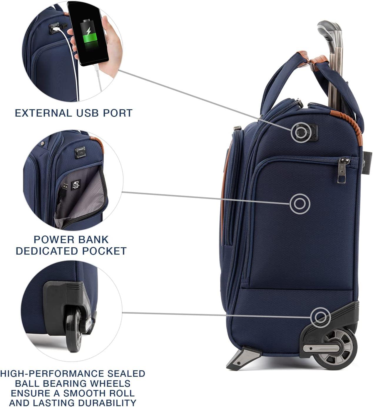 Designed to fit under the seats of most major domestic airlines, The durable crew versapack rolling undersea carry-on keeps you ultra-organized on the fly. Pack it alone for an overnight trip or as a companion to other luggage and enjoy ample interior space, a removable hanging personal organizer with water-resistant compartments and organizational pockets, Padded laptop/tablet sleeves (up to 14″), exterior side pockets fitting for an umbrella or water bottle and a quick-access front pocket with key fob and built-in organizers. Because we've thought of everything, a Travelpro quick slip front pocket with magnetic closure is perfect for storing a cell phone or other essentials when going through airport security, while an external USB port with faa-compliant dedicated power bank pocket lets you power up electronics on the move. Hit the road, sidewalk or terminal on two ultra-strong, high-performance ball bearing wheels that provide a smooth roll over any terrain, led by a height-adjustable PowerScope handle. Carrying options also include dual handles and a rear stacking strap to secure the tote to another rolling bag for hands-free mobility. Built for professional-grade dependability With robust corner armor, skid guards and heavy-duty wheel housings, crew versapack is the civilian version of the luggage flight crews use, tested to meet the same superior quality and durability standards.