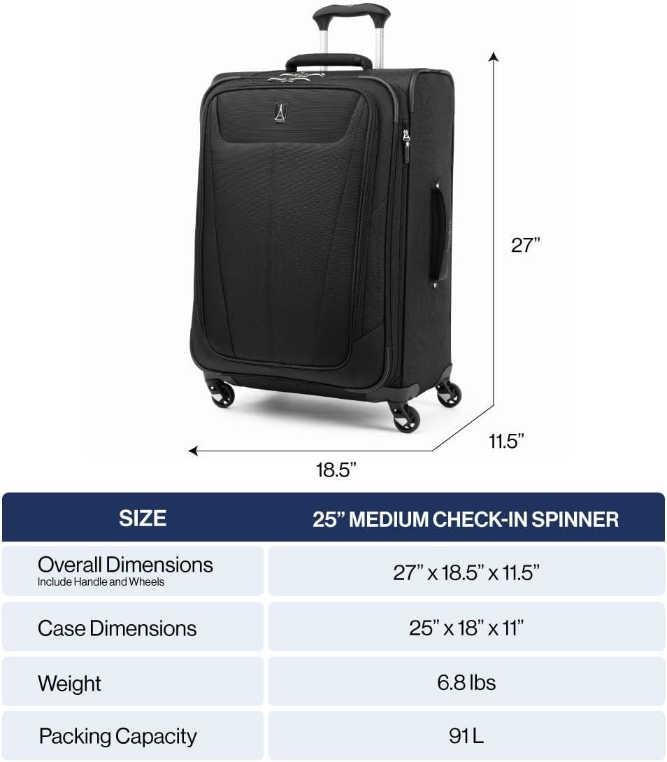 LIGHTWEIGHT: A half pound lighter than Maxlite 4. Case Dimensions: 25″ x 18″ x 11″ | Overall Dimensions (includes wheels and handles): 27″ x 18.5″ x 11.5″ | Weight: 6.8 lbs | Volume: 91 L.