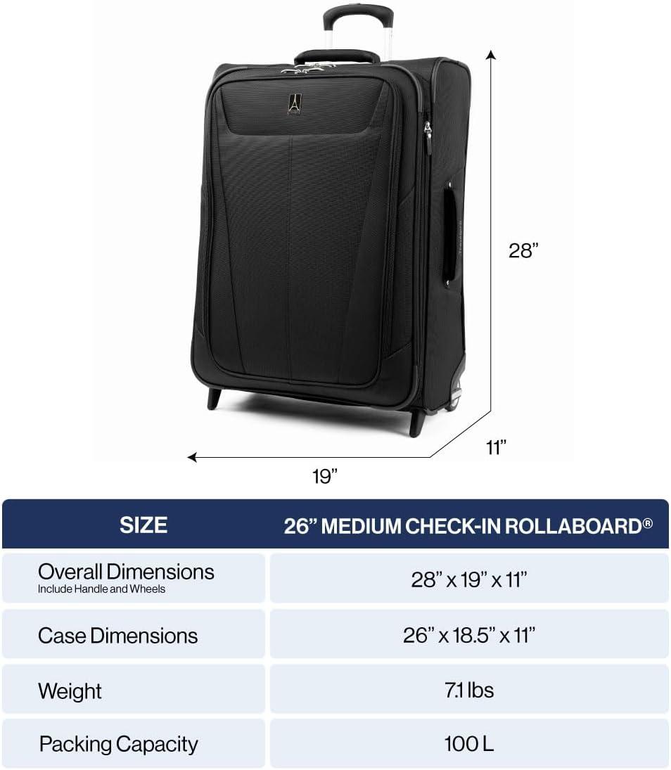 LIGHTWEIGHT: A half pound lighter than Maxlite 4, this medium rollaboard maximizes packing capacity. Case Dimensions: 26″ x 18.5″ x 11″ | Overall Dimensions (includes wheels and handles): 28″ x 19″ x 11″ | Weight: 7.1 lbs | Volume: 100 L.