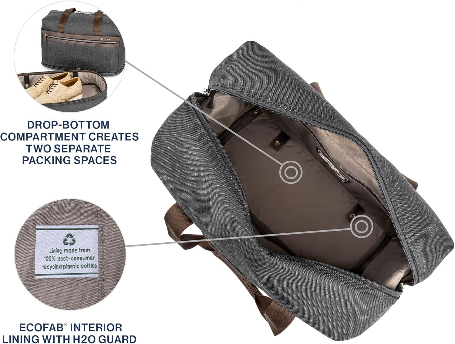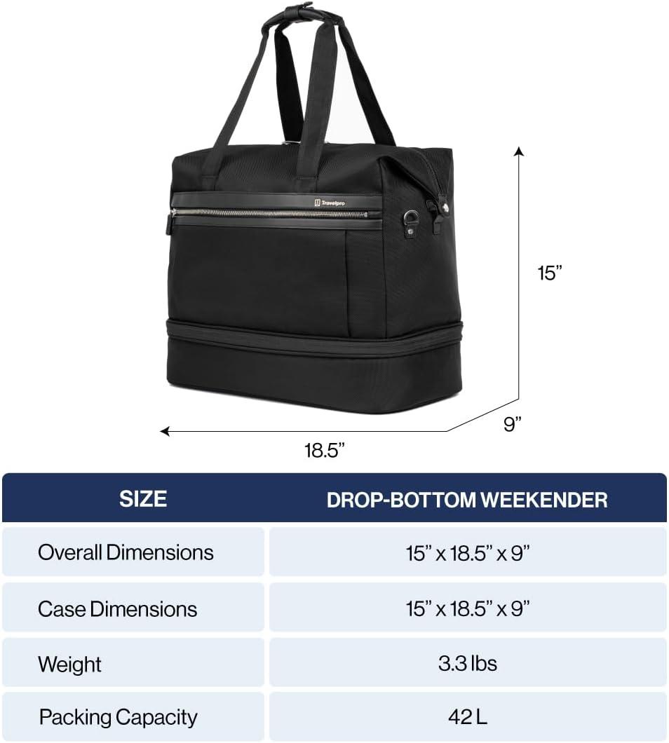 Designed for impressive adaptability with a removable bottom compartment, the Travelpro Platinum Elite Drop-Bottom Weekender makes an excellent gym bag, around-town commuter satchel, and an all-in-one travel carry-on. Fit for far more than weekends, this stylish and durable do-all features a bottom section with a divider panel that can be used to separate shoes or other items from the main compartment or opened to create a larger single interior space. For ultimate convenience, remove the bottom completely to create a smaller bag when needed. Keeping everything organized, an interior padded sleeve protects electronics, and a Travelpro QuickSlip front pocket securely stores a cell phone or other often used item. ECOFAB interior lining is easy to keep clean and made from recycled plastic bottles, while the ultra-durable, high-density exterior fabric is treated to resist stains and abrasions and then finished with full-grain leather details and hardy YKK® zippers for extreme resilience. Carrying options include leather handle touchpoints, a removable, adjustable shoulder strap, and an integrated rear strap that slides over the extension handle of a rolling suitcase for secure stacking.