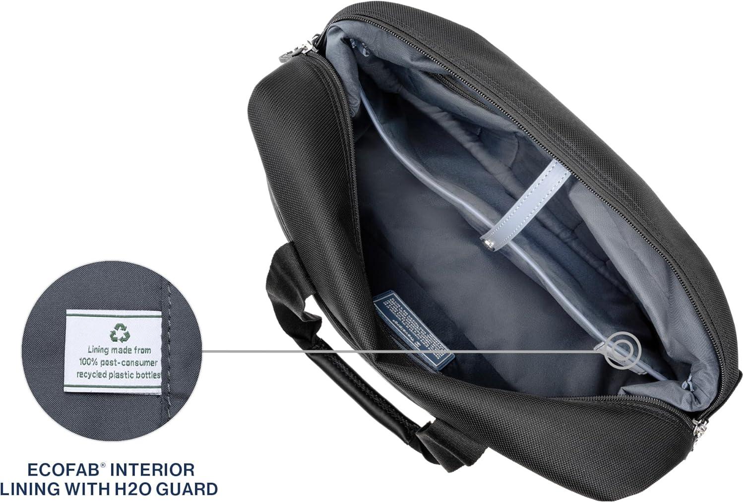 Every day, everywhere, in sophisticated style. The Travelpro Platinum Elite Soft Duffel combines sleek styling with practical, everyday function in an expandable bag built for lasting use. Ultra-durable, high-density fabric is treated to resist stains and abrasions, then finished with full-grain leather details and hardy YKK zippers for extreme resilience. For convenience and adaptability, a double-zippered expansion option adds up to 4 inches of packing capacity when needed, making this duffel perfect for everything from errands and trips to the gym to trips out of town. Built-in organizational features include a padded sleeve to protect electronics and a Travelpro QuickSlip front pocket for securely stashing a cell phone or other often used item. The ECOFAB interior lining is easy to keep clean and made from recycled plastic bottles. Leather handle touchpoints, a removable, adjustable shoulder strap, and an integrated rear strap that slides over the extension handle of a rolling suitcase for secure stacking offer ideal carrying options for any activity.
