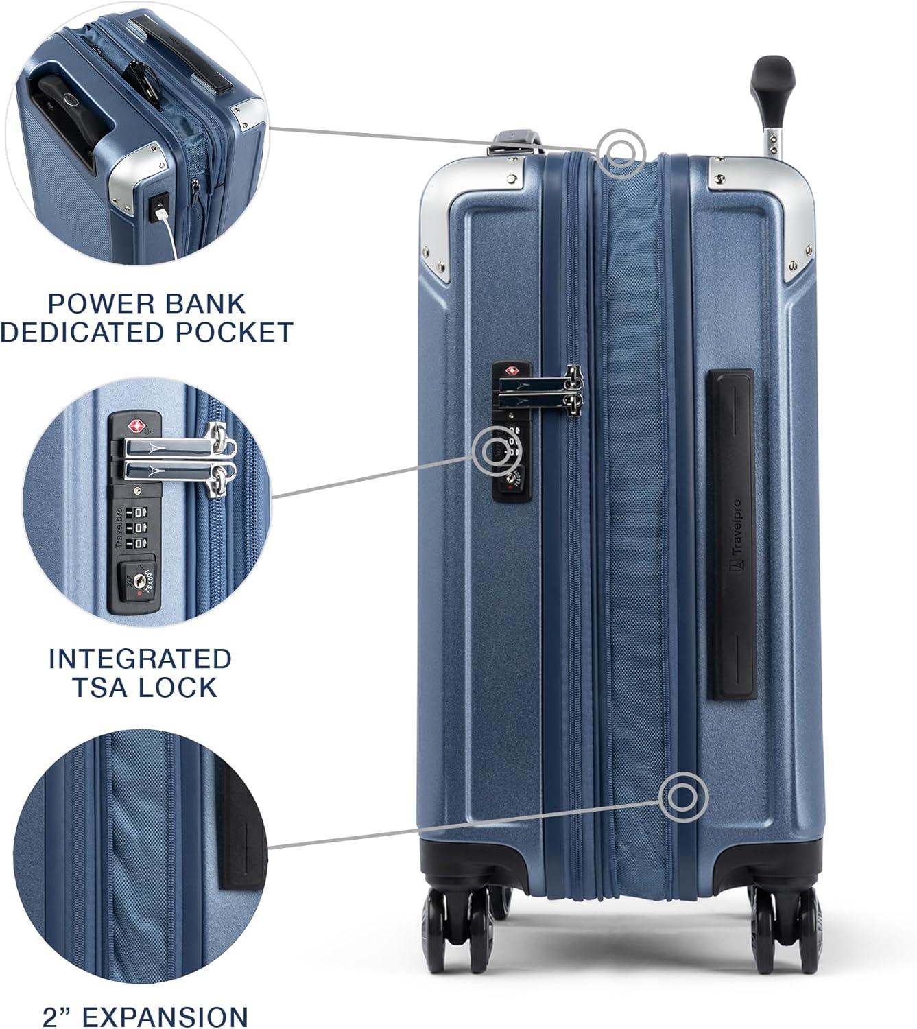 Sleek and sophisticated styling in a compact hard case carry-on that upgrades your travel experience–the Platinum® Elite Compact Carry-on Expandable Hardside Spinner pairs great looks and ultra-durability with effortless mobility in an innovative carryon suitcase packed with modern conveniences. Carry on luggage 22x14x9 airline approved powers your electronics on the go using external USB A & C ports with fast-charge capabilities and a dedicated external-access battery pocket (patent pending) that provides FAA-compliant storage for your power bank. This carry on bag with wheels also offers a zippered 2” expansion option that gives you increased packing capacity when needed and complies with published carry-on size restrictions for nearly all major domestic airlines. As hard-working as it is good looking, this carryon luggage hardside spinner is durably constructed with an ultra-strong, easy-to-clean, 100% polycarbonate hard shell that flexes upon impact to prevent cracking and keep contents protected, while its attractive textured finish helps reduce the visibility of scuffs or scratching. This hard case carry on luggage has genuine leather trim that adds sophistication, and distinctive aluminum corner armor protects high-impact areas in style. The built-in TSA-approved lock allows authorities secure access for inspection when required. Pack this hard shell carry on luggage with ease inside the clamshell design with two zippered divider panels that keep contents separated and stored securely in place. Multiple accessory pockets provide built-in organization, and a convenient, water-resistant pocket stows damp items or toiletries for this carry on hard shell luggage. On the move, this compact beauty flies with precise control and effortless roll, thanks to the Travelpro® exclusive PrecisionGlide™ System–eight MagnaTrac® self-aligning spinner wheels led by a sturdy, four-stop adjustable PowerScope Lite handle with comfortable Contour Grip. This carryon luggage with spinner wheels is backed by our Built For a Lifetime Limited Warranty with the Trusted Companion Promise that even covers damage caused by airlines or other common carriers for the first five years of the lifetime warranty.