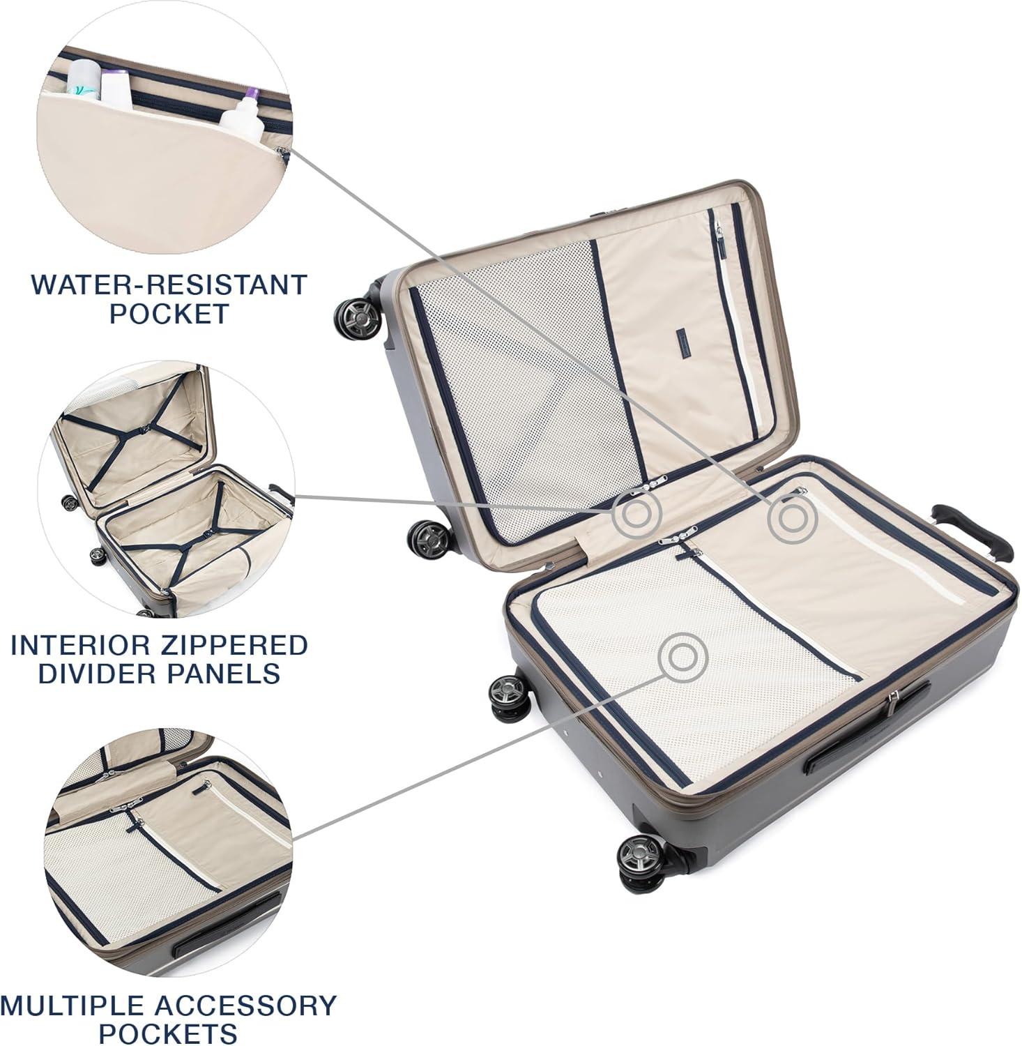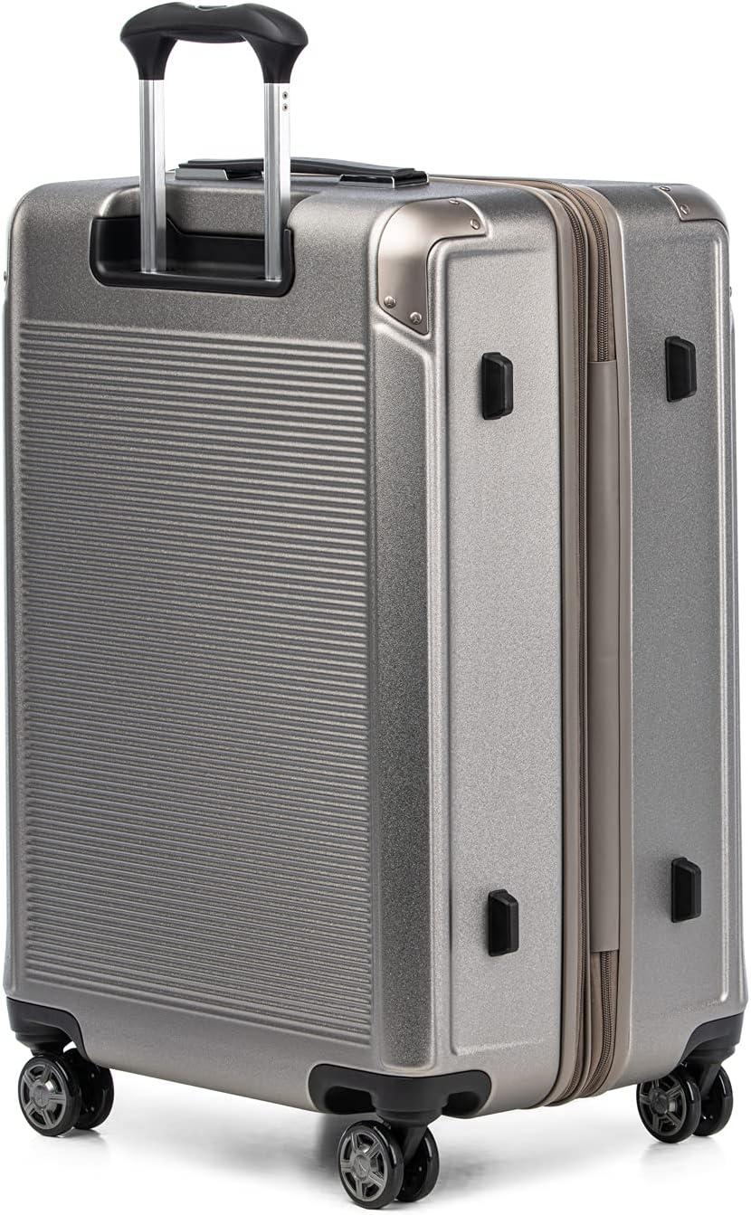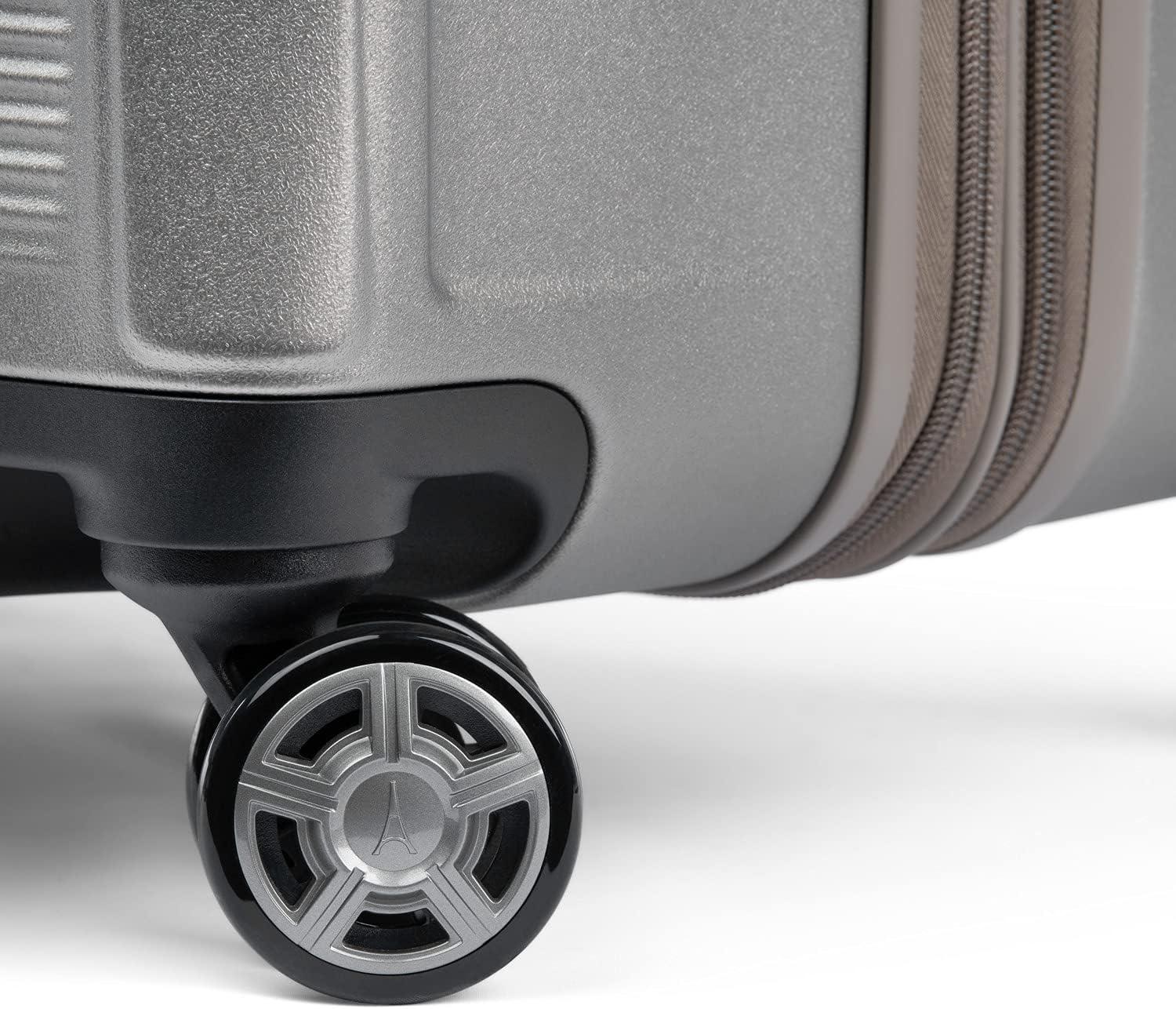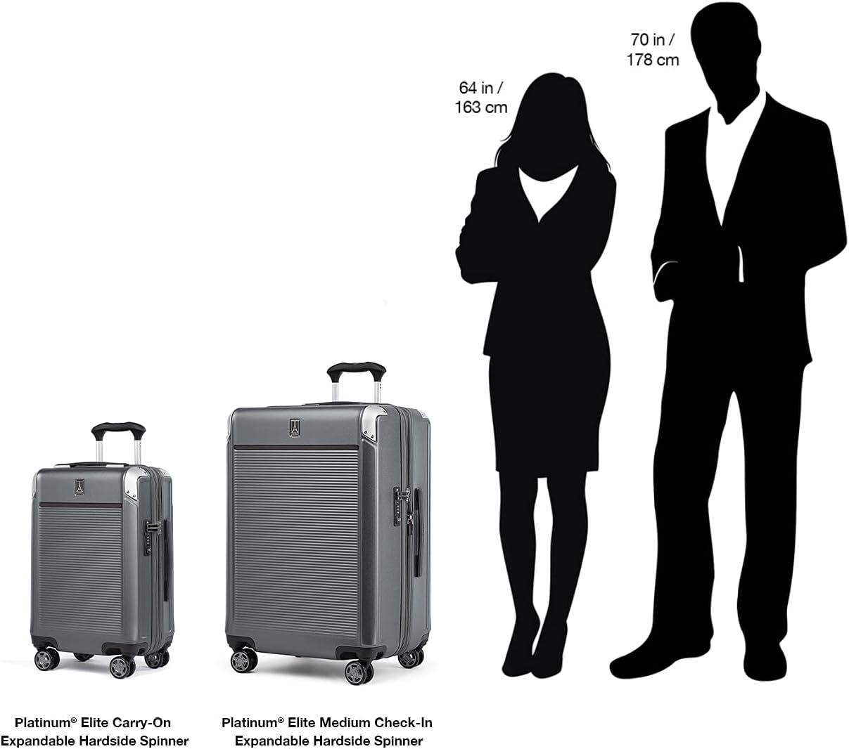 Sleek and sophisticated styling in a compact hard case carry-on that upgrades your travel experience–the Platinum® Elite Compact Carry-on Expandable Hardside Spinner pairs great looks and ultra-durability with effortless mobility in an innovative carryon suitcase packed with modern conveniences. Carry on luggage 22x14x9 airline approved powers your electronics on the go using external USB A & C ports with fast-charge capabilities and a dedicated external-access battery pocket (patent pending) that provides FAA-compliant storage for your power bank. This carry on bag with wheels also offers a zippered 2” expansion option that gives you increased packing capacity when needed and complies with published carry-on size restrictions for nearly all major domestic airlines. As hard-working as it is good looking, this carryon luggage hardside spinner is durably constructed with an ultra-strong, easy-to-clean, 100% polycarbonate hard shell that flexes upon impact to prevent cracking and keep contents protected, while its attractive textured finish helps reduce the visibility of scuffs or scratching. This hard case carry on luggage has genuine leather trim that adds sophistication, and distinctive aluminum corner armor protects high-impact areas in style. The built-in TSA-approved lock allows authorities secure access for inspection when required. Pack this hard shell carry on luggage with ease inside the clamshell design with two zippered divider panels that keep contents separated and stored securely in place. Multiple accessory pockets provide built-in organization, and a convenient, water-resistant pocket stows damp items or toiletries for this carry on hard shell luggage. On the move, this compact beauty flies with precise control and effortless roll, thanks to the Travelpro® exclusive PrecisionGlide™ System–eight MagnaTrac® self-aligning spinner wheels led by a sturdy, four-stop adjustable PowerScope Lite handle with comfortable Contour Grip. This carryon luggage with spinner wheels is backed by our Built For a Lifetime Limited Warranty with the Trusted Companion Promise that even covers damage caused by airlines or other common carriers for the first five years of the lifetime warranty.