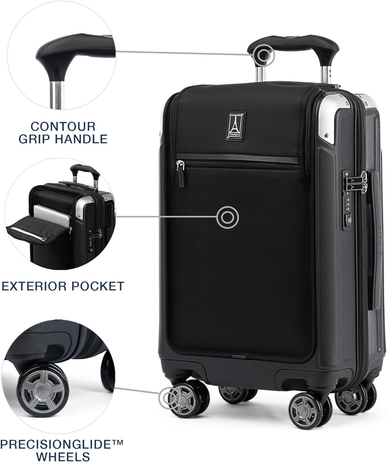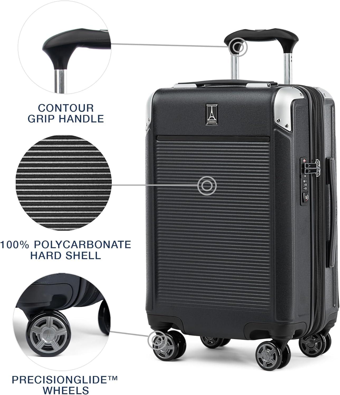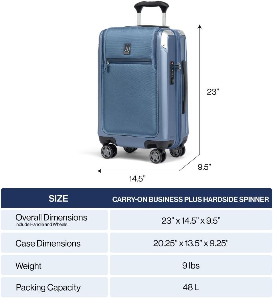 Sleek and sophisticated styling in a compact hard case carry-on that upgrades your travel experience–the Platinum® Elite Compact Carry-on Expandable Hardside Spinner pairs great looks and ultra-durability with effortless mobility in an innovative carryon suitcase packed with modern conveniences. Carry on luggage 22x14x9 airline approved powers your electronics on the go using external USB A & C ports with fast-charge capabilities and a dedicated external-access battery pocket (patent pending) that provides FAA-compliant storage for your power bank. This carry on bag with wheels also offers a zippered 2” expansion option that gives you increased packing capacity when needed and complies with published carry-on size restrictions for nearly all major domestic airlines. As hard-working as it is good looking, this carryon luggage hardside spinner is durably constructed with an ultra-strong, easy-to-clean, 100% polycarbonate hard shell that flexes upon impact to prevent cracking and keep contents protected, while its attractive textured finish helps reduce the visibility of scuffs or scratching. This hard case carry on luggage has genuine leather trim that adds sophistication, and distinctive aluminum corner armor protects high-impact areas in style. The built-in TSA-approved lock allows authorities secure access for inspection when required. Pack this hard shell carry on luggage with ease inside the clamshell design with two zippered divider panels that keep contents separated and stored securely in place. Multiple accessory pockets provide built-in organization, and a convenient, water-resistant pocket stows damp items or toiletries for this carry on hard shell luggage. On the move, this compact beauty flies with precise control and effortless roll, thanks to the Travelpro® exclusive PrecisionGlide™ System–eight MagnaTrac® self-aligning spinner wheels led by a sturdy, four-stop adjustable PowerScope Lite handle with comfortable Contour Grip. This carryon luggage with spinner wheels is backed by our Built For a Lifetime Limited Warranty with the Trusted Companion Promise that even covers damage caused by airlines or other common carriers for the first five years of the lifetime warranty.