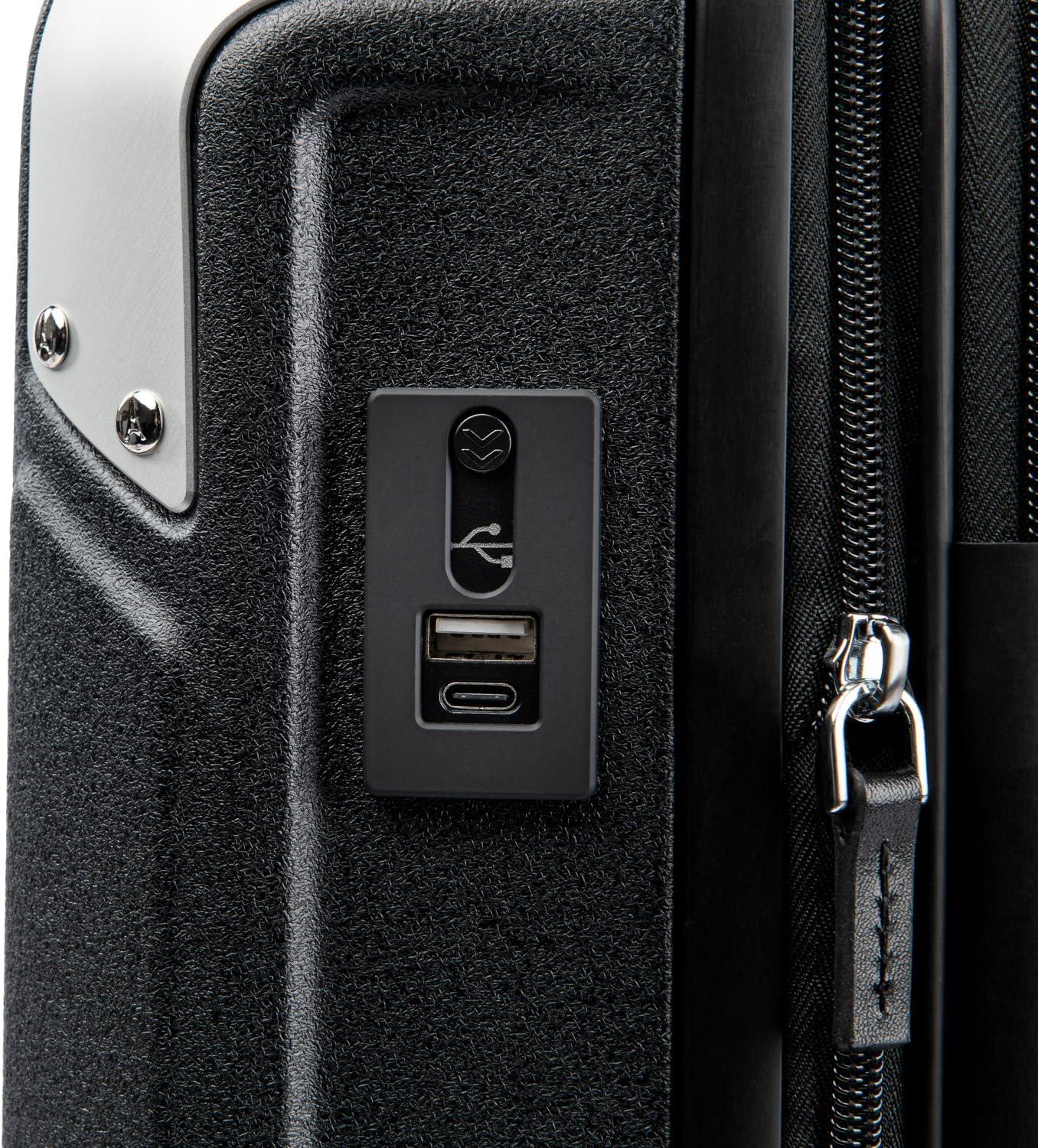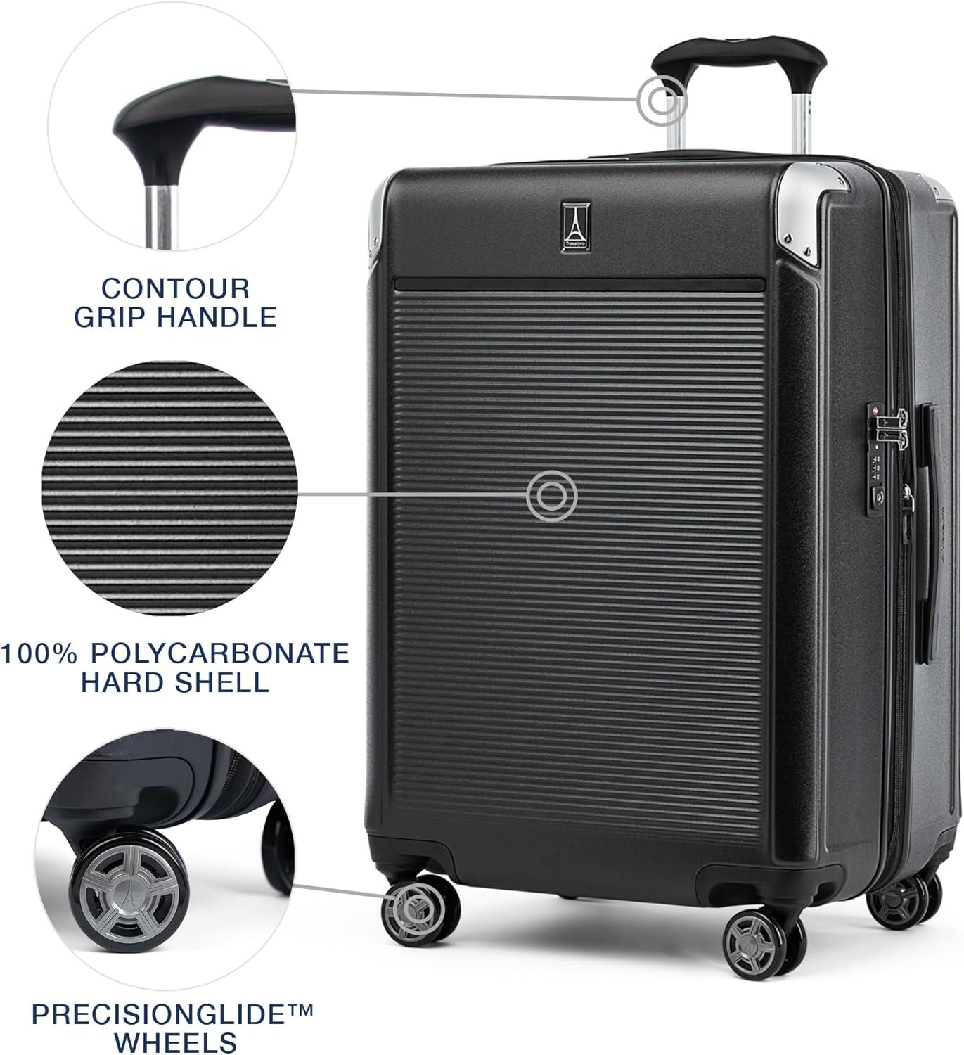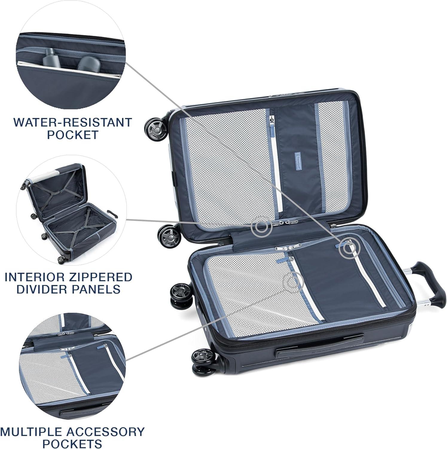 Sleek and sophisticated styling in a compact hard case carry-on that upgrades your travel experience–the Platinum® Elite Compact Carry-on Expandable Hardside Spinner pairs great looks and ultra-durability with effortless mobility in an innovative carryon suitcase packed with modern conveniences. Carry on luggage 22x14x9 airline approved powers your electronics on the go using external USB A & C ports with fast-charge capabilities and a dedicated external-access battery pocket (patent pending) that provides FAA-compliant storage for your power bank. This carry on bag with wheels also offers a zippered 2” expansion option that gives you increased packing capacity when needed and complies with published carry-on size restrictions for nearly all major domestic airlines. As hard-working as it is good looking, this carryon luggage hardside spinner is durably constructed with an ultra-strong, easy-to-clean, 100% polycarbonate hard shell that flexes upon impact to prevent cracking and keep contents protected, while its attractive textured finish helps reduce the visibility of scuffs or scratching. This hard case carry on luggage has genuine leather trim that adds sophistication, and distinctive aluminum corner armor protects high-impact areas in style. The built-in TSA-approved lock allows authorities secure access for inspection when required. Pack this hard shell carry on luggage with ease inside the clamshell design with two zippered divider panels that keep contents separated and stored securely in place. Multiple accessory pockets provide built-in organization, and a convenient, water-resistant pocket stows damp items or toiletries for this carry on hard shell luggage. On the move, this compact beauty flies with precise control and effortless roll, thanks to the Travelpro® exclusive PrecisionGlide™ System–eight MagnaTrac® self-aligning spinner wheels led by a sturdy, four-stop adjustable PowerScope Lite handle with comfortable Contour Grip. This carryon luggage with spinner wheels is backed by our Built For a Lifetime Limited Warranty with the Trusted Companion Promise that even covers damage caused by airlines or other common carriers for the first five years of the lifetime warranty.