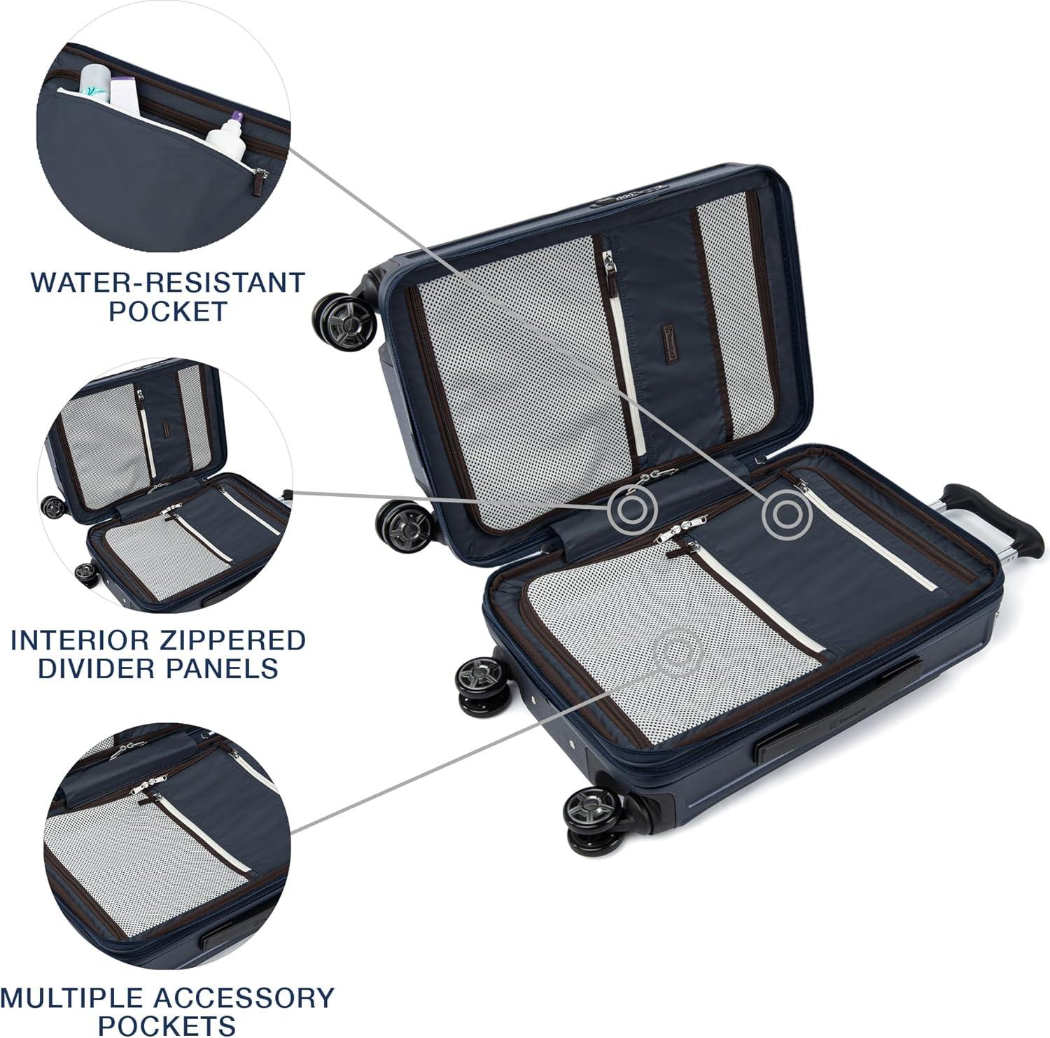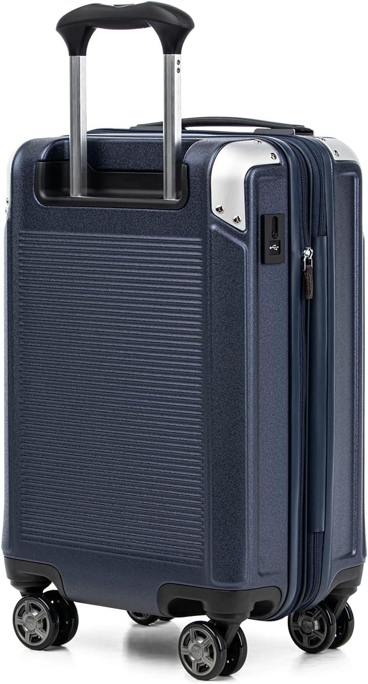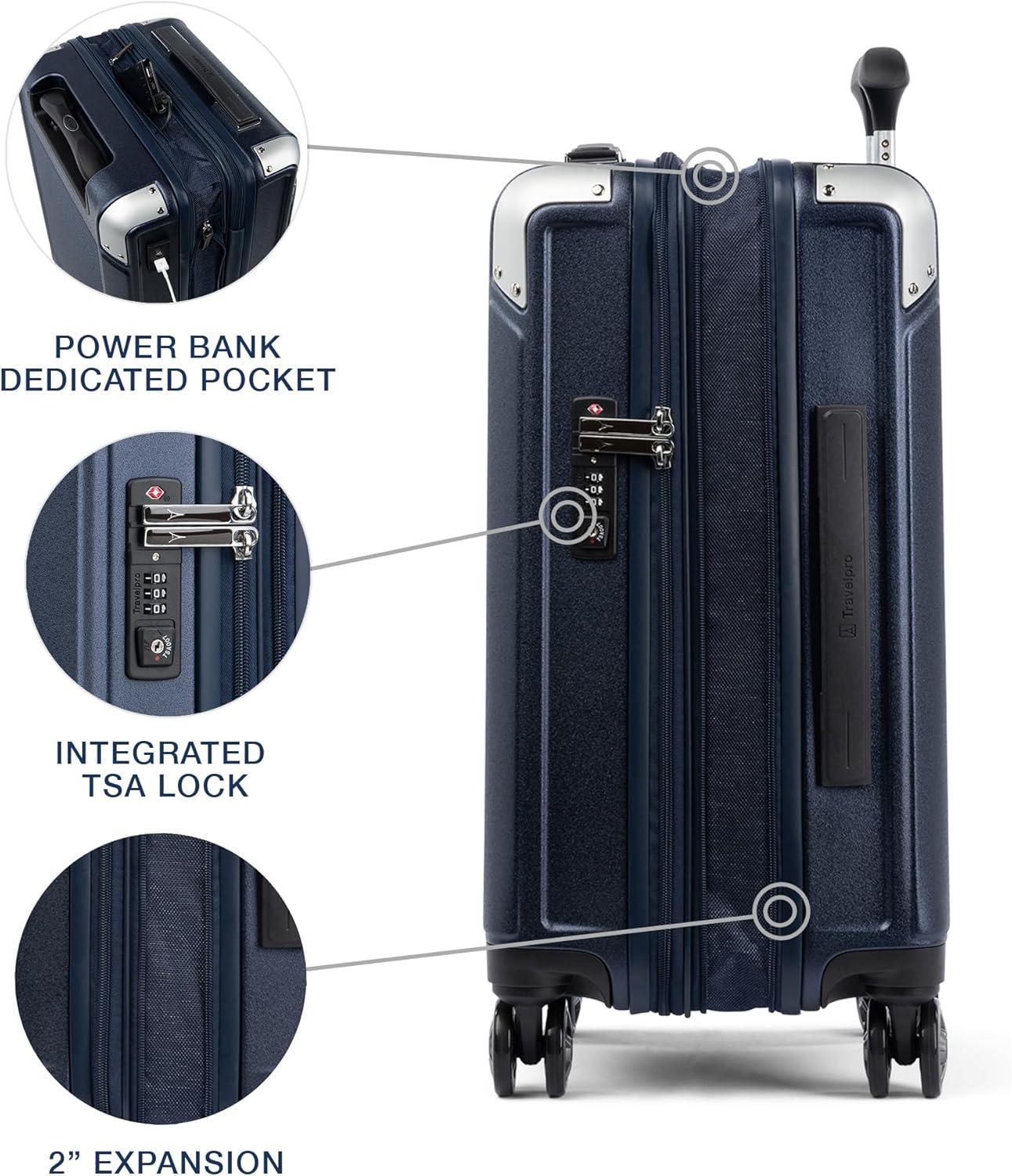 Sleek and sophisticated styling in a compact hard case carry-on that upgrades your travel experience–the Platinum® Elite Compact Carry-on Expandable Hardside Spinner pairs great looks and ultra-durability with effortless mobility in an innovative carryon suitcase packed with modern conveniences. Carry on luggage 22x14x9 airline approved powers your electronics on the go using external USB A & C ports with fast-charge capabilities and a dedicated external-access battery pocket (patent pending) that provides FAA-compliant storage for your power bank. This carry on bag with wheels also offers a zippered 2” expansion option that gives you increased packing capacity when needed and complies with published carry-on size restrictions for nearly all major domestic airlines. As hard-working as it is good looking, this carryon luggage hardside spinner is durably constructed with an ultra-strong, easy-to-clean, 100% polycarbonate hard shell that flexes upon impact to prevent cracking and keep contents protected, while its attractive textured finish helps reduce the visibility of scuffs or scratching. This hard case carry on luggage has genuine leather trim that adds sophistication, and distinctive aluminum corner armor protects high-impact areas in style. The built-in TSA-approved lock allows authorities secure access for inspection when required. Pack this hard shell carry on luggage with ease inside the clamshell design with two zippered divider panels that keep contents separated and stored securely in place. Multiple accessory pockets provide built-in organization, and a convenient, water-resistant pocket stows damp items or toiletries for this carry on hard shell luggage. On the move, this compact beauty flies with precise control and effortless roll, thanks to the Travelpro® exclusive PrecisionGlide™ System–eight MagnaTrac® self-aligning spinner wheels led by a sturdy, four-stop adjustable PowerScope Lite handle with comfortable Contour Grip. This carryon luggage with spinner wheels is backed by our Built For a Lifetime Limited Warranty with the Trusted Companion Promise that even covers damage caused by airlines or other common carriers for the first five years of the lifetime warranty.