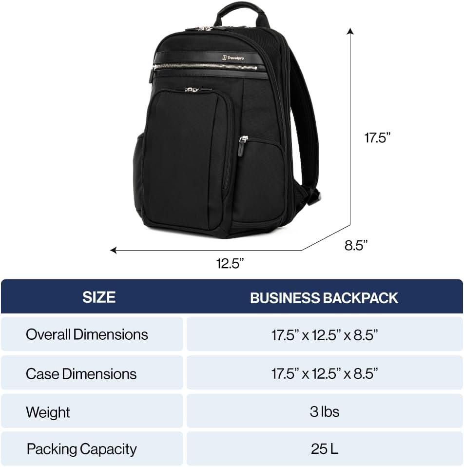 With slimmer styling and the ability to pack plenty, the multi-tasking Travelpro Platinum Elite Slim Backpack is an ideal companion for everyday use, whether you’re running between work, home, school, and the gym or just running errands. Inside-out organization includes padded sleeves to protect electronics, a Travelpro ID TheftBlock pocket to protect credit cards and passports against loss and identity theft, and compartments for power cords, power banks, and more. Exterior side pockets are perfect for water bottles or an umbrella, and a Travelpro QuickSlip front pocket securely stores a cell phone or other often used item for quick retrieval. Constructed for frequent and lasting use, this backpack has ECOFAB interior lining that is easy to clean and made from recycled plastic bottles, and ultra-durable, high-density exterior fabric that is treated to resist stains and abrasions. Full-grain leather touches add sophistication and hardy YKK zippers stay on track and glide with ease. Carrying options include a leather top handle, ergonomic, adjustable shoulder straps, and an integrated rear strap that slides over the extension handle of a rolling suitcase for secure stacking.