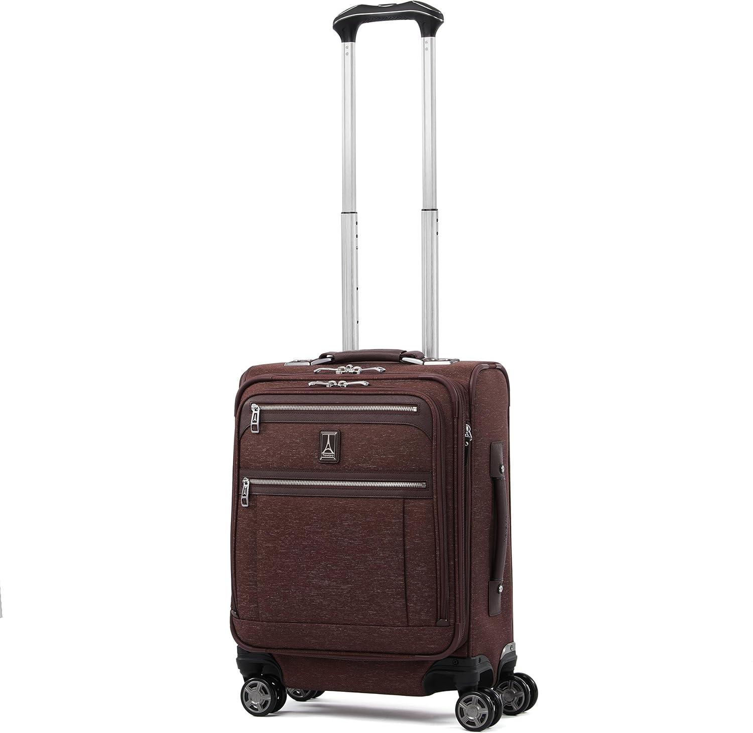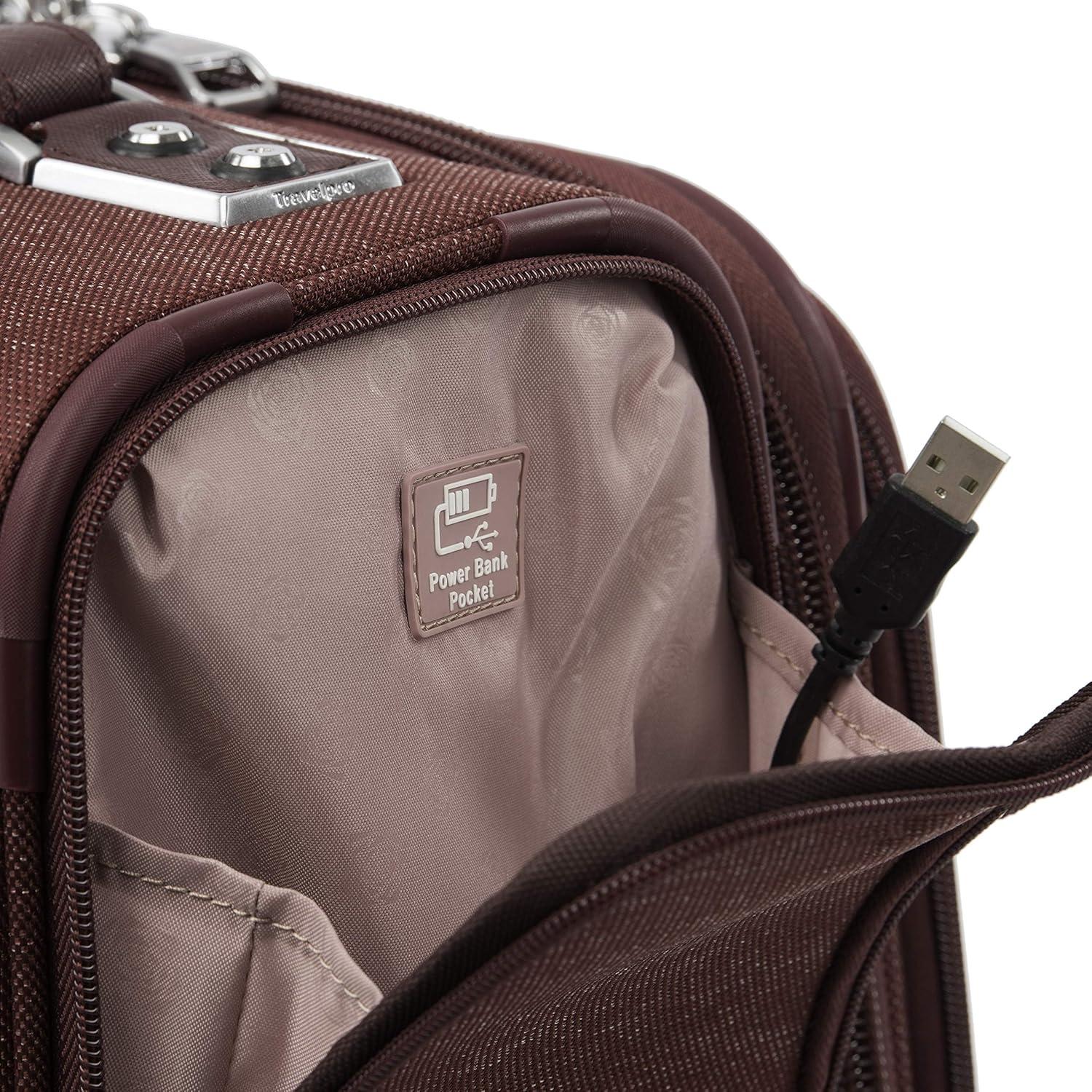 Maximize your carry-on with sophisticated style. The Platinum Elite 21″ Expandable carry-on suitcase delivers big on form and function with a tip-resistant expansion that offers up to 2″ more packing capacity. This premium Travelpro carry-on luggage features a deluxe tie-down system, integrated accessory pockets, and a removable quart-size wet pocket that is TSA compliant and perfect for toiletries. Plus, the drop-in, fold-out suiter is specifically designed to accommodate hanging clothes and prevent wrinkling. Built-in USB port lets you power up on the go, while a dedicated powerbank pocket for your back-up battery adheres to FAA regulations. Perfect for short to medium-length trips, this carry-on luggage with wheels is crafted with premium fabrics, genuine leather, and chrome zippers. Top-of-the-line mobility features include the PrecisionGlide system with eight MagnaTrac, self-aligning, 360-degree spinner wheels—making it one of the smoothest-rolling suitcases with wheels—guided by an adjustable PowerScope extension handle with patented Contour Grip and rubberized touch points for comfortable, easy maneuvering wherever you go. Whether you prefer softside luggage or hard cases, this versatile piece stands out among Travelpro luggage for its durability and style. It’s an ideal choice for travelers seeking reliable wheeled luggage that meets most airline carry-on requirements. Backed by our Built for a Lifetime Limited Worry-Free Warranty, which covers the cost of repair for damage from airline or other common carriers for the life of the bag after registration under the Trusted Companion Promise.