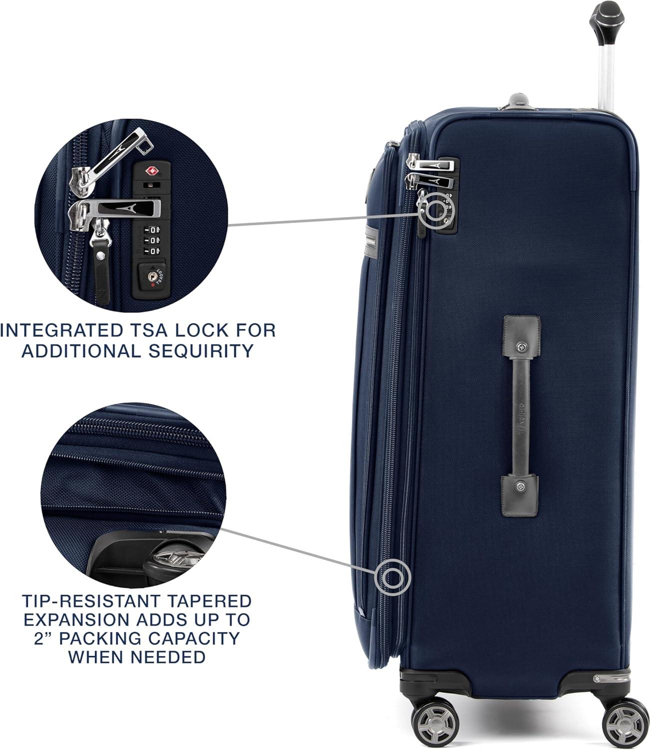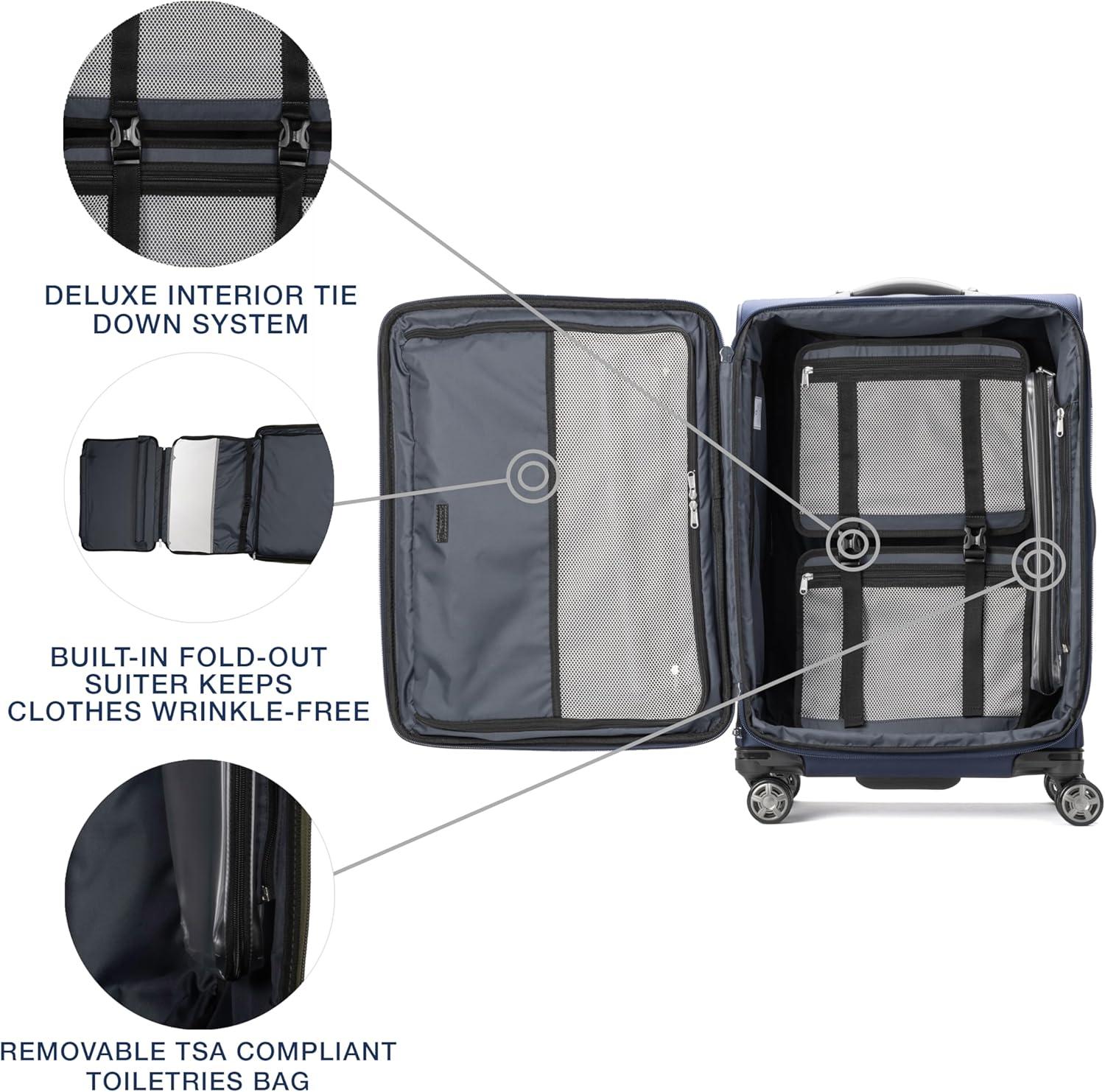 Maximize your carry-on with sophisticated style. The Platinum Elite 21″ Expandable carry-on suitcase delivers big on form and function with a tip-resistant expansion that offers up to 2″ more packing capacity. This premium Travelpro carry-on luggage features a deluxe tie-down system, integrated accessory pockets, and a removable quart-size wet pocket that is TSA compliant and perfect for toiletries. Plus, the drop-in, fold-out suiter is specifically designed to accommodate hanging clothes and prevent wrinkling. Built-in USB port lets you power up on the go, while a dedicated powerbank pocket for your back-up battery adheres to FAA regulations. Perfect for short to medium-length trips, this carry-on luggage with wheels is crafted with premium fabrics, genuine leather, and chrome zippers. Top-of-the-line mobility features include the PrecisionGlide system with eight MagnaTrac, self-aligning, 360-degree spinner wheels—making it one of the smoothest-rolling suitcases with wheels—guided by an adjustable PowerScope extension handle with patented Contour Grip and rubberized touch points for comfortable, easy maneuvering wherever you go. Whether you prefer softside luggage or hard cases, this versatile piece stands out among Travelpro luggage for its durability and style. It’s an ideal choice for travelers seeking reliable wheeled luggage that meets most airline carry-on requirements. Backed by our Built for a Lifetime Limited Worry-Free Warranty, which covers the cost of repair for damage from airline or other common carriers for the life of the bag after registration under the Trusted Companion Promise.