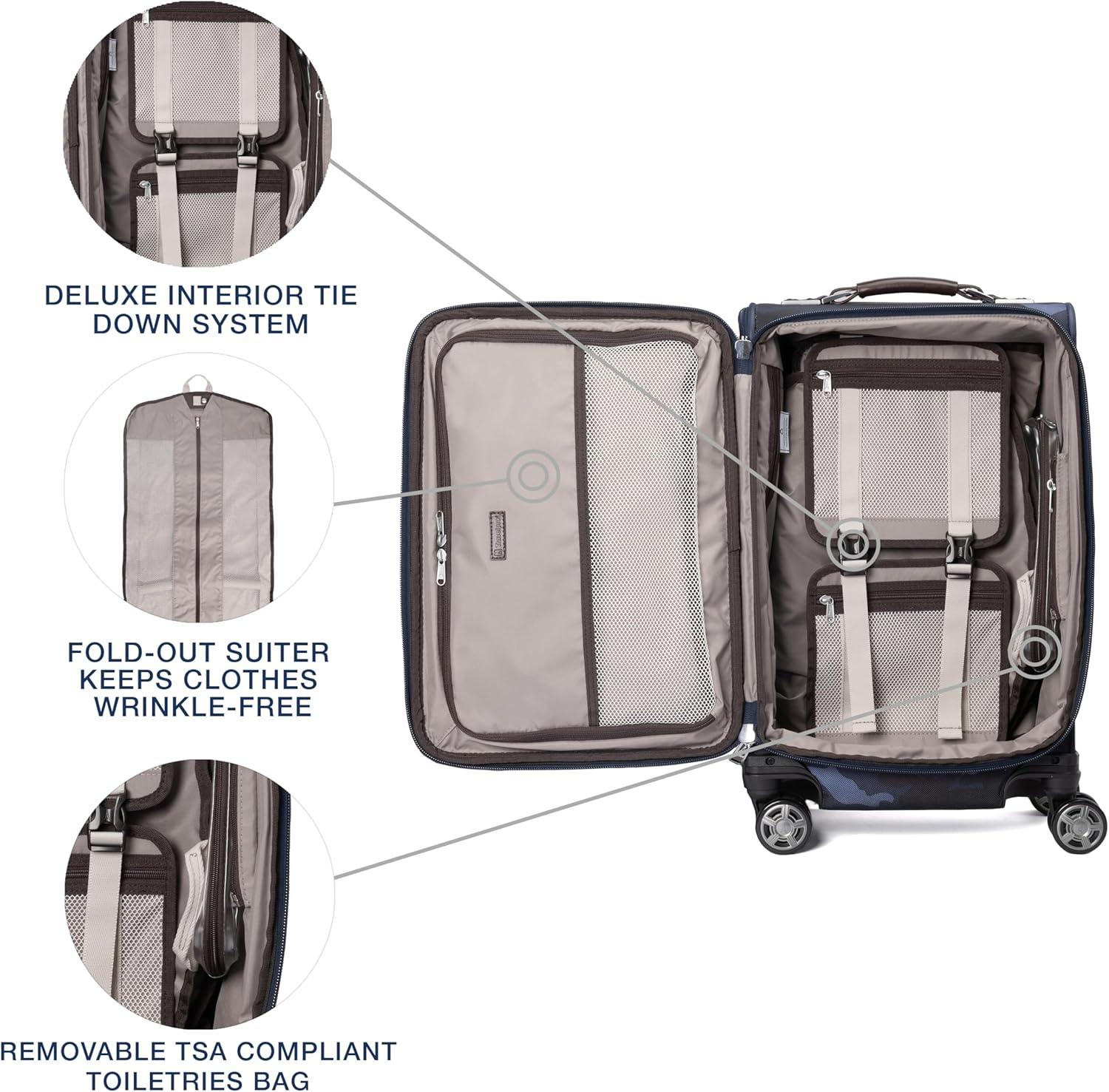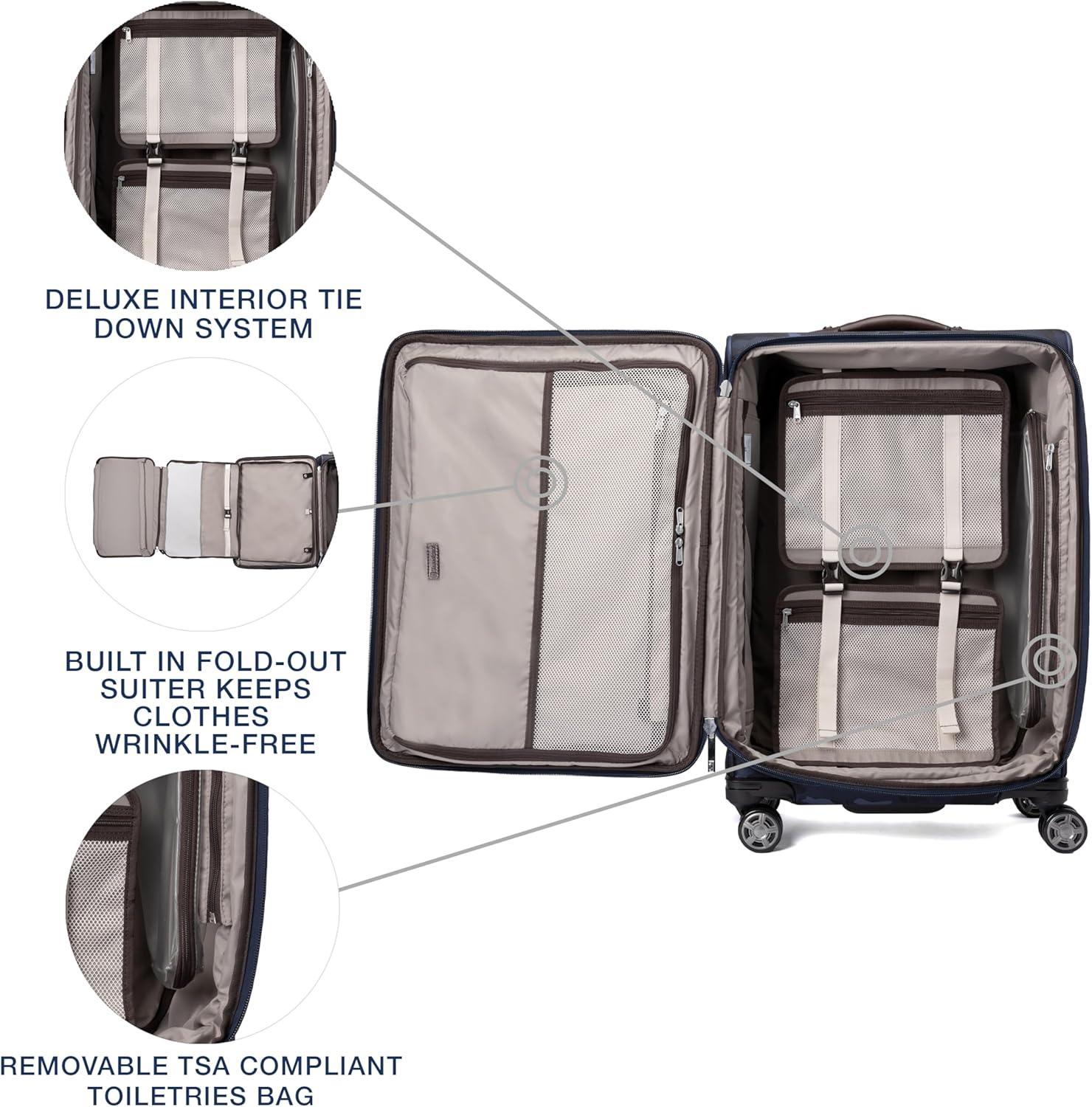 Finally, great looking checked luggage that is as functional and durable as it is stylish. The Platinum Elite 25″ Expandable Spinner is perfect for medium and long trips, accommodating everything you need, guarding against wrinkles with a built-in suiter and keeping everything organized under a deluxe tie-down system with integrated accessory pockets. Constructed with premium fabrics, leather accents and chrome zippers, this gorgeous bag also features a tip-resistant tapered expansion option that provides up to 2″ additional packing capacity. Integrated lock allows TSA authorities to safely unlock and lock suitcase for inspection when needed (default lock code is 0-0-0 to open). For effortless mobility, this 25″ suitcase is equipped with our Precision Glide system-eight MagnaTrac, self-aligning, 360-degree spinner wheels guided by an adjustable PowerScope extension handle with patented Contour Grip and rubberized touch points, ergonomically designed to be easy on the hands. Backed by Travelpro built for a lifetime limited warranty with our trusted companion promise which covers the cost of repair for damage from airline or other common carrier for 1 year.