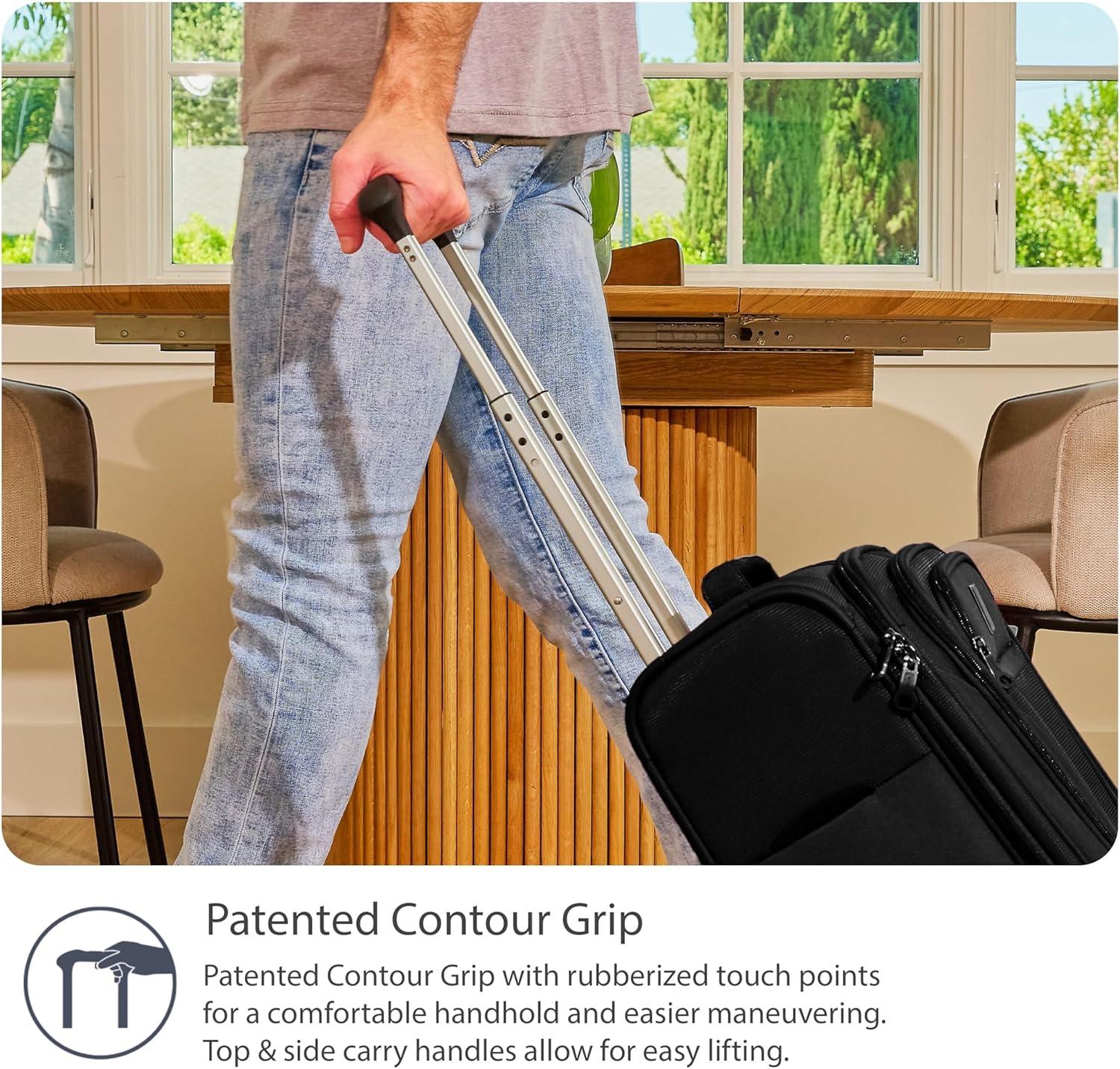 360 SPINNER WHEELS + PATENTED CONTOUR GRIP HANDLE: Each suitcase has 4 spinner wheels that rotate 360 degrees for easy and smooth rolling. The adjustable PowerScope handle, with Travelpros patented Contour Grip, can be set to two heights: 38 in and 42.5 in. The Contour Grip handle has rubberized touch points at the top, bottom, and side for a more comfortable carrying. With three easy-grip handles, this luggage set is designed for effortless lifting and maneuvering.