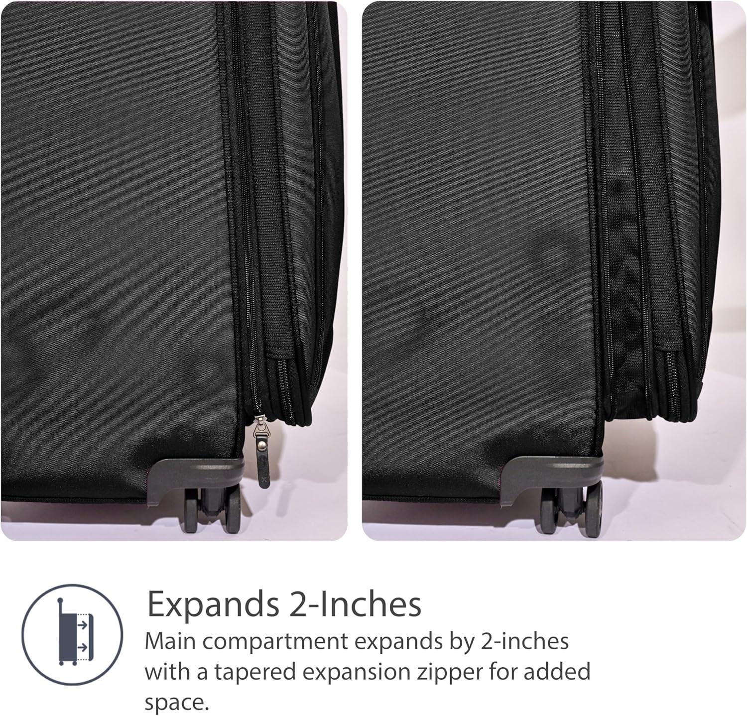 EXPANDABLE ZIPPER + ORGANZATION POCKETS: Each piece of luggage has a tapered expansion zipper, providing an additional two inches of packing space when needed. The ergonomic, high-tensile zippers are designed to be both durable and easy to use. For quick access to essentials, both suitcases include two exterior pockets. Inside, you will find a spacious interior featuring a full-length mesh pocket, a side mesh pocket, and adjustable compression straps to keep your belongings securely in place.