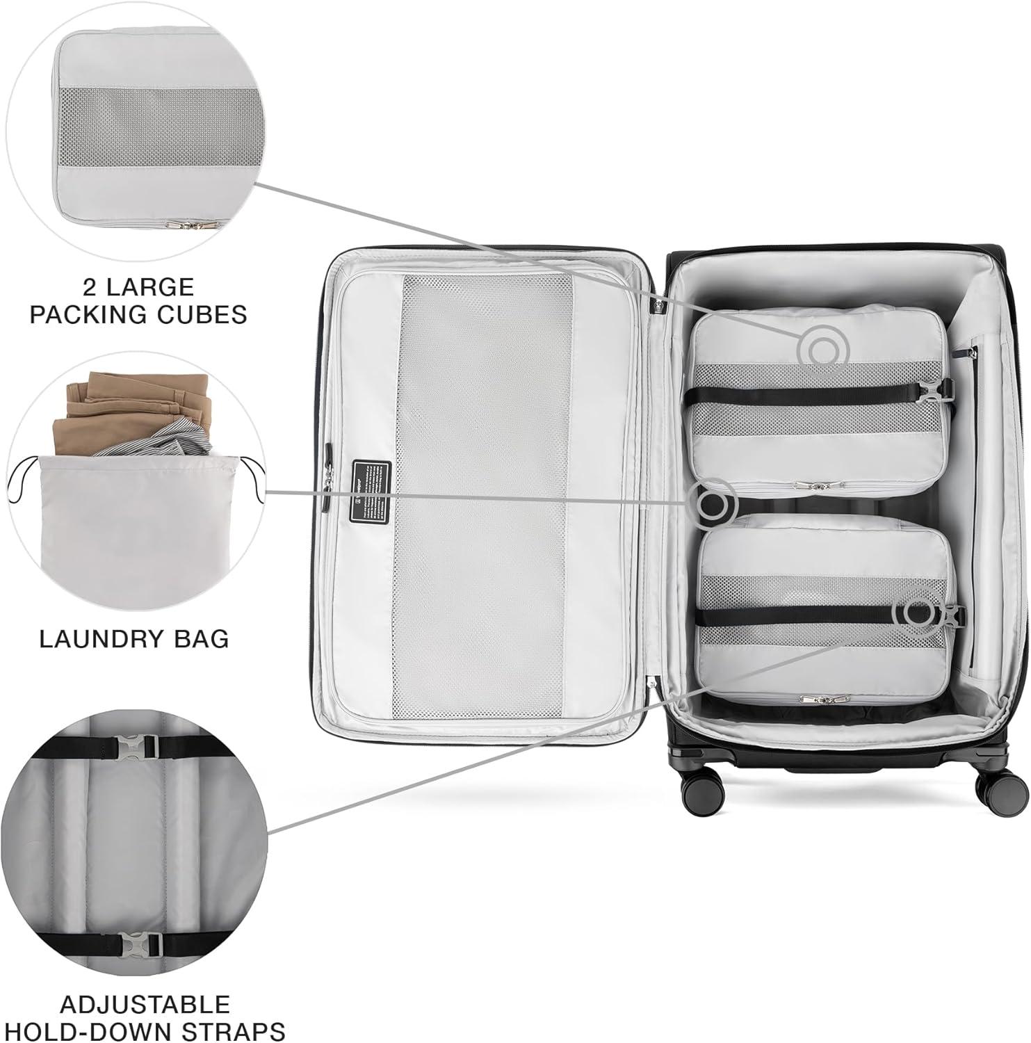 Designed to meet checked luggage size restrictions for most airlines, the durable VersaPack®+ Large Check-in Expandable Spinner gives you ultimate packing versatility with advanced features that maximize capacity and keep all contents organized and secured against damage or loss. Two removable large packing cubes and built-in interior pockets make the most of your packing space, while a removable laundry bag and built-in wet pocket separate damp or soiled items from everything else. Pack for a long trip or several people and check it with peace of mind. The built-in TSA-compliant lock guards against theft while allowing authorities to safely unlock and relock the bag when required for inspection. For lasting looks and long-term durability, this spinner is constructed with hardy YKK® zippers, rugged and stain-resistant exterior ballistic nylon fabric, and water-resistant ECOFAB™ interior lining made from 100% post-consumer recycled plastic bottles to reduce environmental waste. On the move, the PrecisionGlide® System gives you precise control and effortless roll on eight ultra-durable, 360° MagnaTrac® self-aligning spinner wheels led by a sturdy, four-stop, height adjustable PowerScope Handle with a comfortable Contour Grip. Covered by a Built for a Lifetime Limited Warranty with our 3-Year Trusted Companion Promise, which covers damage caused by an airline or other common carrier.