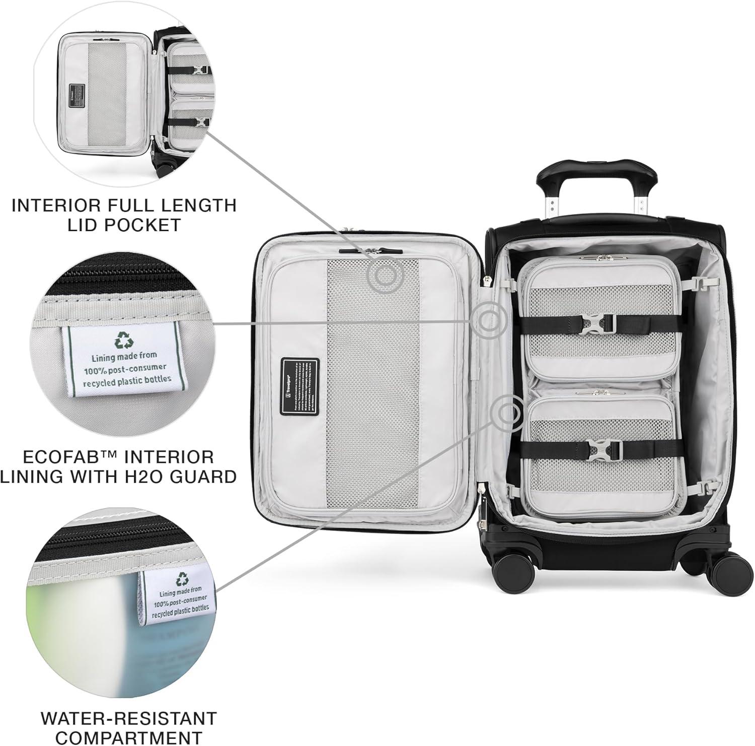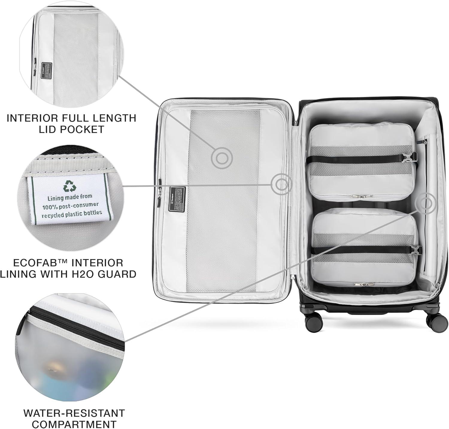 Softside luggage has ECOFAB interior lining with H2O guard is made from 100% post-consumer recycled plastic bottles (Approx. 15.5 bottles). DIMENSIONS: Overall (includes wheels & handles) 30.75 in x 18 in x 13.25 in, Case: 27.75 in x 17 in x 12.75 in